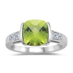 This luminous Peridot and Diamond Womens Ring puts the emphasis on a cushion checker board Peridot channel set, ornate with four splendid Diamonds prong set in 14K White Gold. Approximate Gemstone Weight: 2.04 Carats. Approximate Diamond Weight: 0.08 Carats. Make a sophisticated style statement with this wonderful ring. This product is sold by JEWELS-BY-SABRINA.,METAL:14K Gold,ACTUAL METAL:14K White Gold,RHODIUM:Yes,NUMBER OF DIAMONDS:4,SHAPE:Round,MINIMUM COLOR:H,MINIMUM CLARITY:SI,MINIMUM CARAT TOTAL WEIGHT:0.08,SETTING STYLE:Prong Setting,GEMSTONE:Peridot,SHAPE:Cushion Checker Board,AVERAGE COLOR:Medium Green,AVERAGE QUALITY:AA,MINIMUM CARAT TOTAL WEIGHT:2.04,GEMSTONE DIMENSIONS:8 mm,SETTING STYLE:Channel Setting,NUMBER OF STONES:1,COLOR:Green- White,PRODUCT TYPE:Fashion Ring,GENDER:Womens,MATERIAL:Gemstone-White Diamond